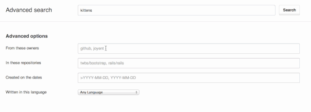 *YYYY*-*MM*-*DD*..*YYYY*-*MM*-*DD* | vue pushed:2016-04-30..2016-07-04 匹配含有 "vue" 字样、在 2016 年 4 月末到 7 月之间推送的仓库。 |