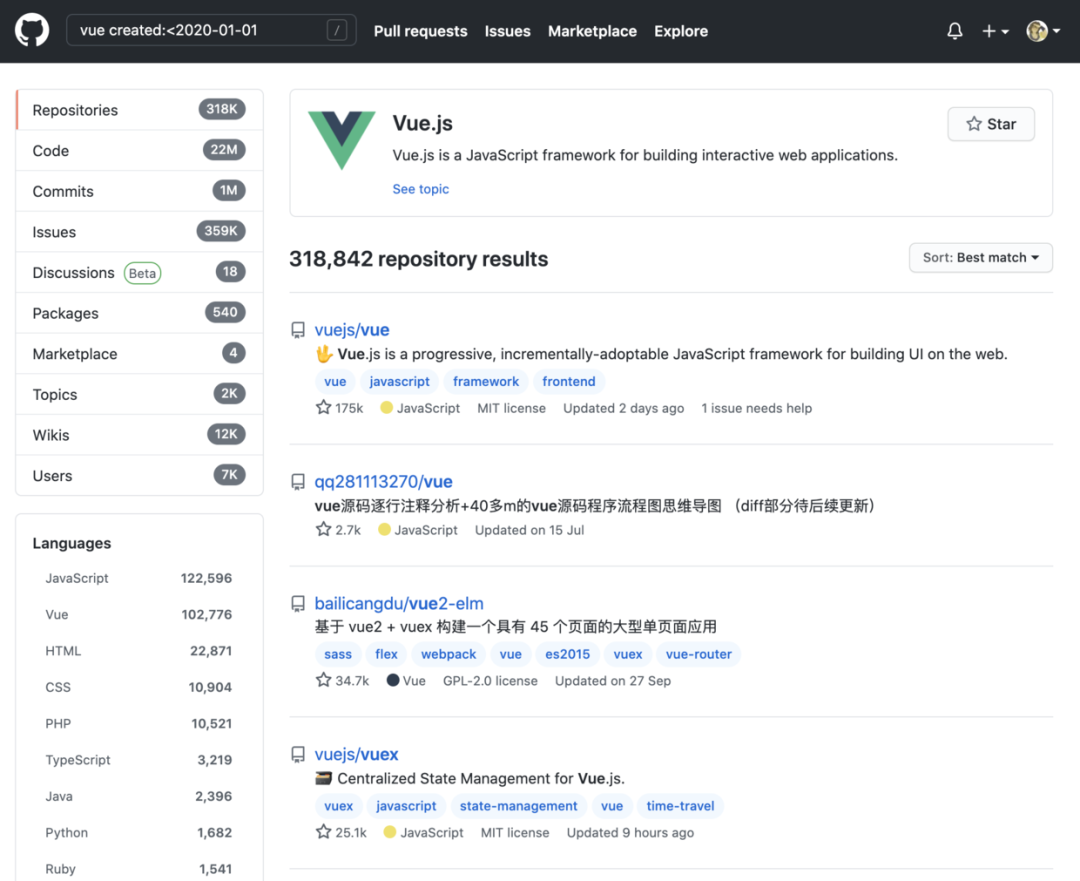 >=n vue topics:>=5 匹配含有 "vue" 字样、有 5 个或更多主题的仓库
