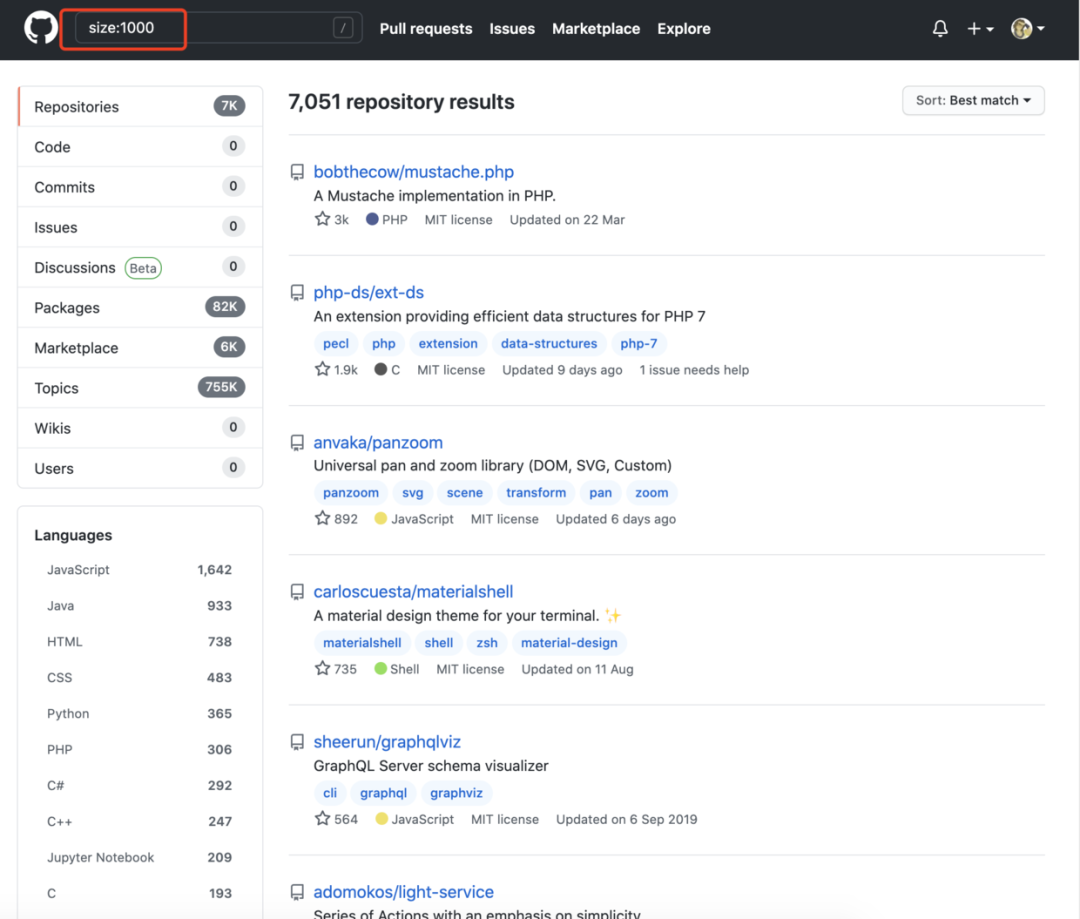 python in:name stars:>1000 forks:>500 就表示星数大于 1000 且 forks 数大于 500,名字中含有 python 的项目。