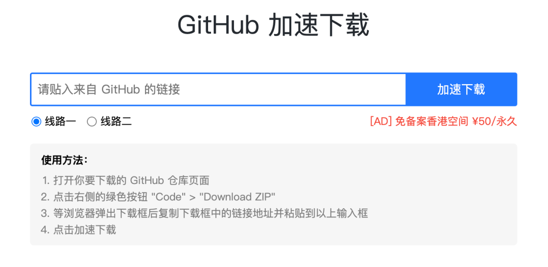 下面这个网站是一个 GitHub 加速下载网站,打开你要下载的 GitHub 仓库页面,点击右侧额绿色按钮点击 Download ZIP,等浏览器弹出下载框后复制下载框中的链接地址粘贴到这个网站即可。